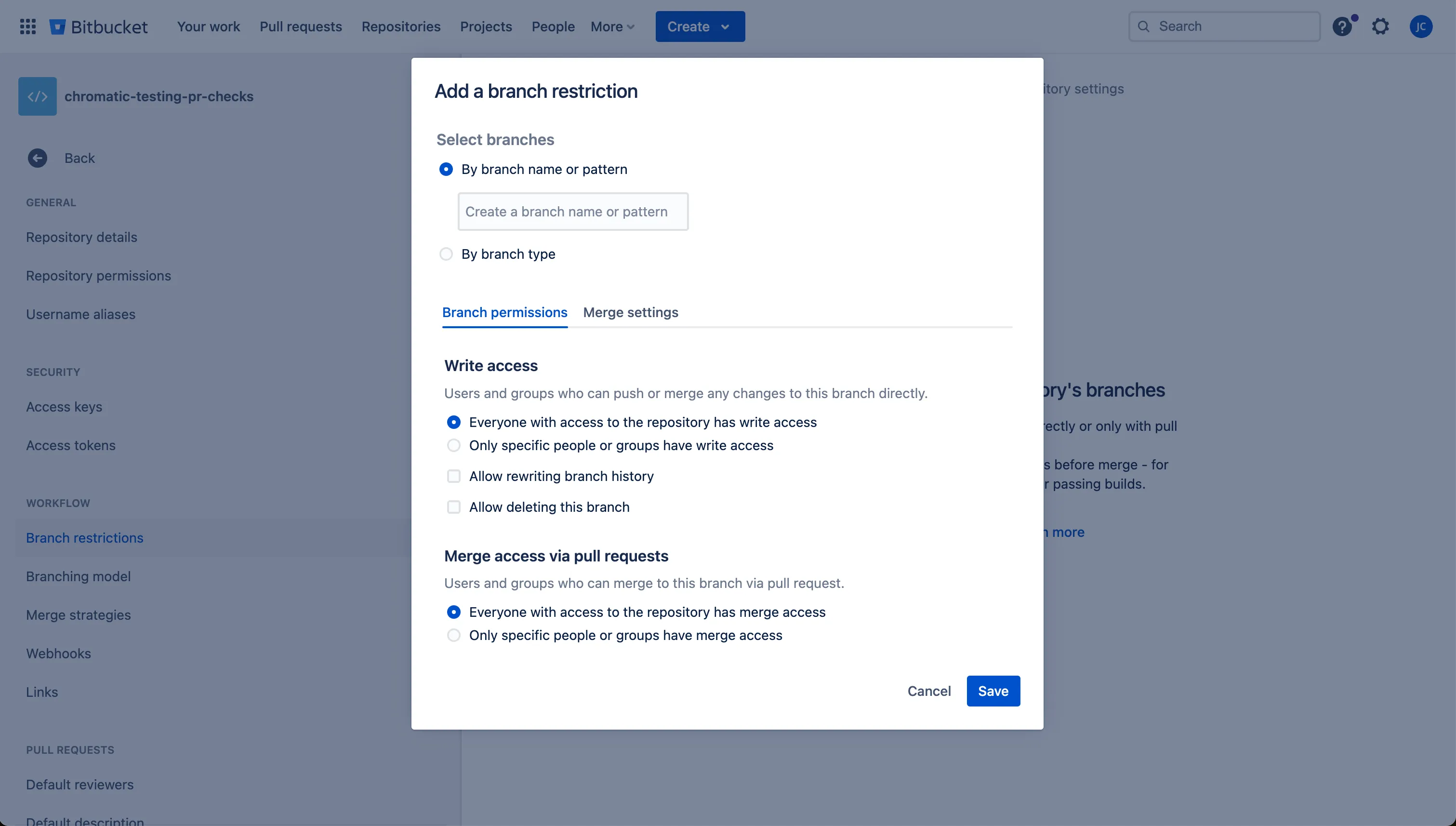 - Click on the Add a branch restriction button